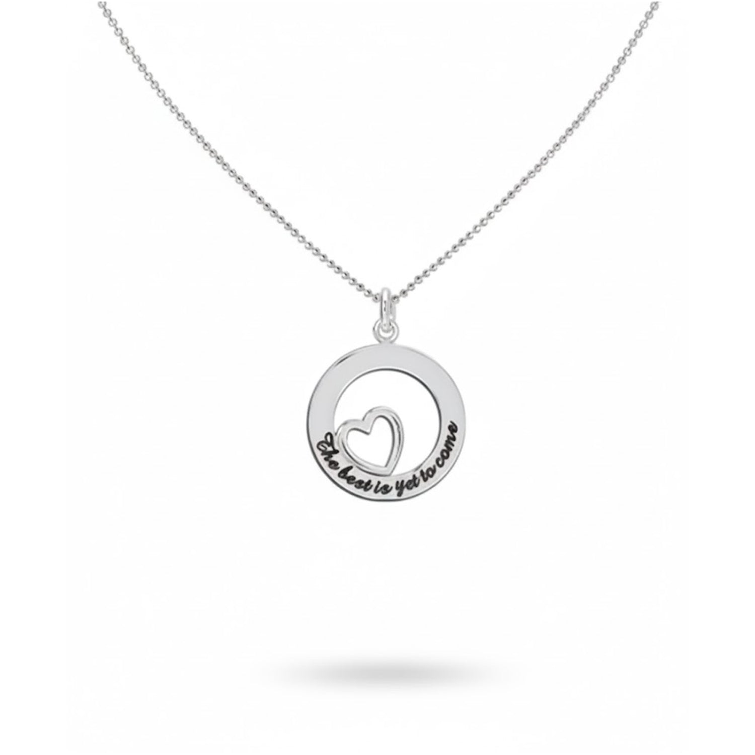 Este collar combina elegancia y mensaje. Su colgante circular en plata de ley 925 encierra un delicado corazón y lleva grabado “The best is yet to come”, una frase que inspira esperanza y nuevos comienzos. Con cadena ajustable y acabado brillante, es perfecto para regalar o llevar como recordatorio personal de que lo mejor aún está por llegar.