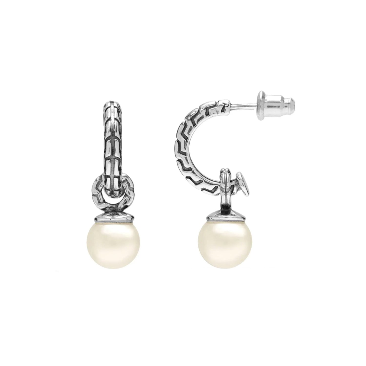 Elegancia clásica con un toque moderno. Estos pendientes presentan un aro texturizado con diseño tipo cadena en plata de ley 925, del que cuelga una delicada perla blanca. Su estilo sofisticado los convierte en el complemento perfecto para ocasiones especiales o para dar un aire refinado a tu look diario.