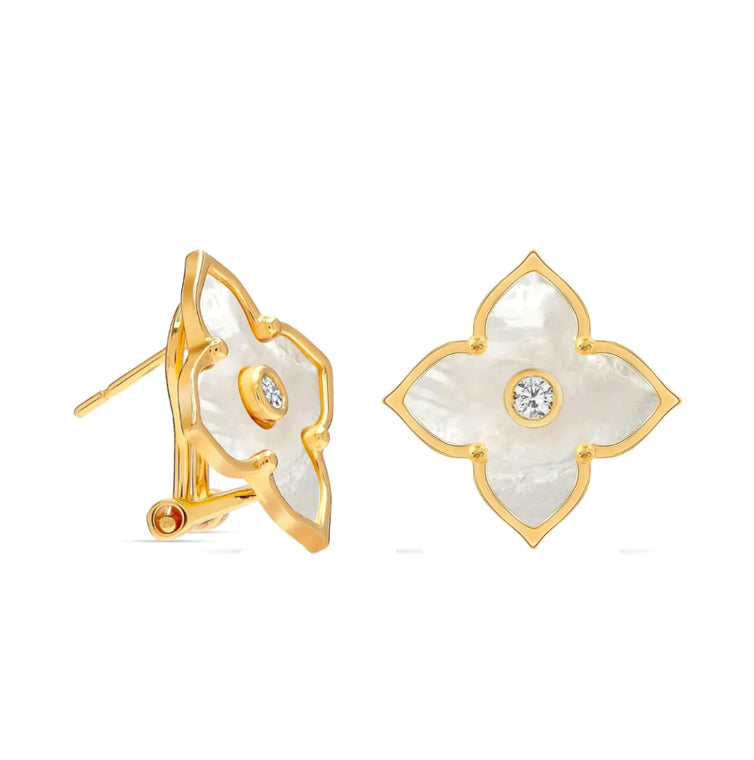 Pendientes de Botón Nácar Diseño Trébol de Cuatro Hojas baño Oro
