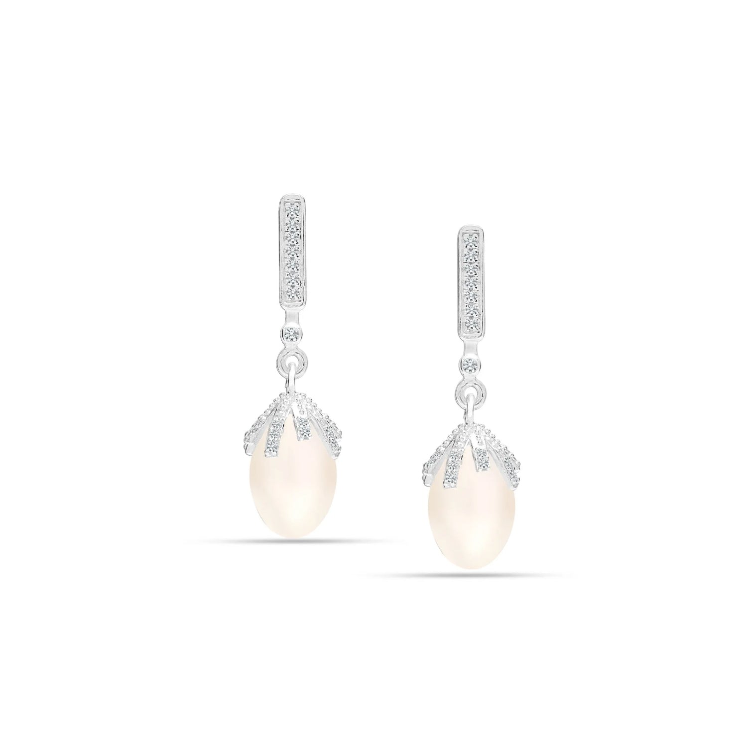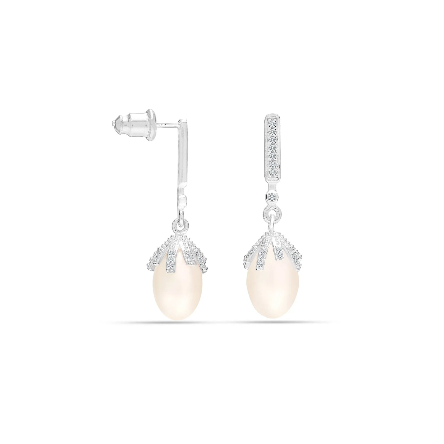 • Una perla ovalada suspendida, adornada con una corona decorativa en plata, también engastada con circonitas.