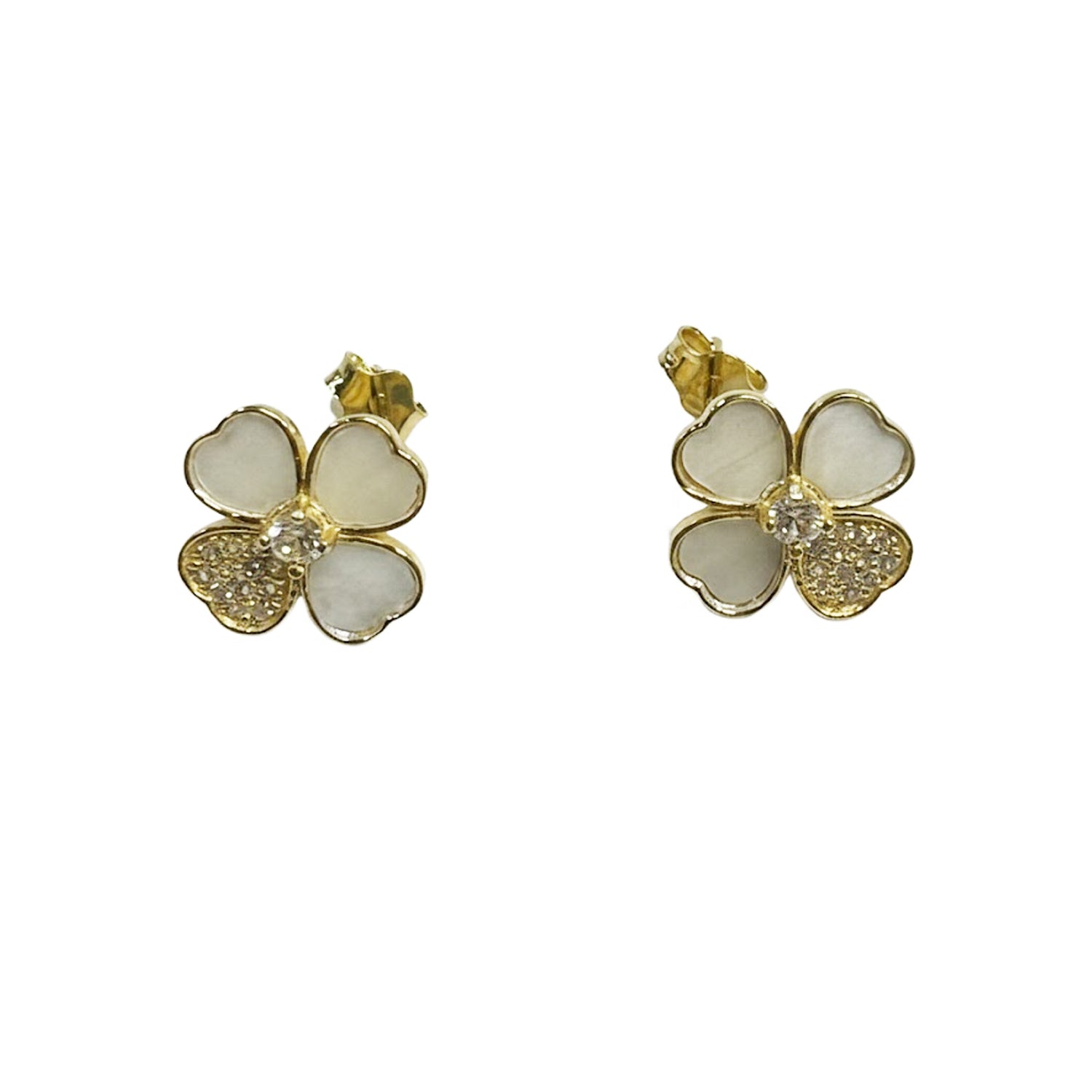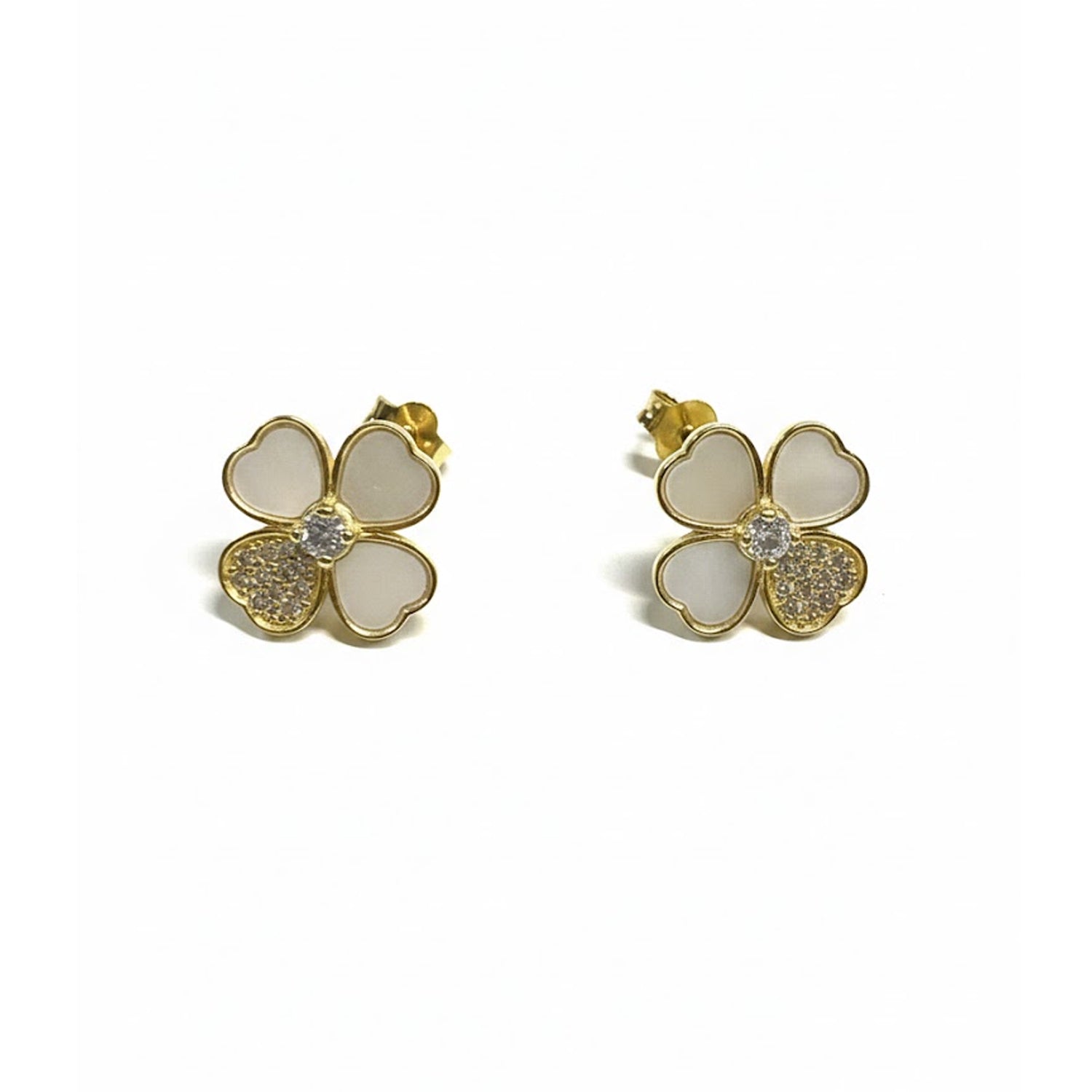 Pendientes de botón en forma de trébol de cuatro hojas, elaborados con baño de oro amarillo y detalles en esmalte blanco. Tres pétalos presentan un acabado liso y brillante, mientras el cuarto resplandece con pequeñas circonitas que aportan un toque de luz y distinción. En el centro, una piedra delicada completa el diseño, simbolizando suerte, armonía y elegancia. Su tamaño discreto y su estilo romántico los convierten en el complemento perfecto para mujeres que buscan piezas con significado y belleza atemporal.